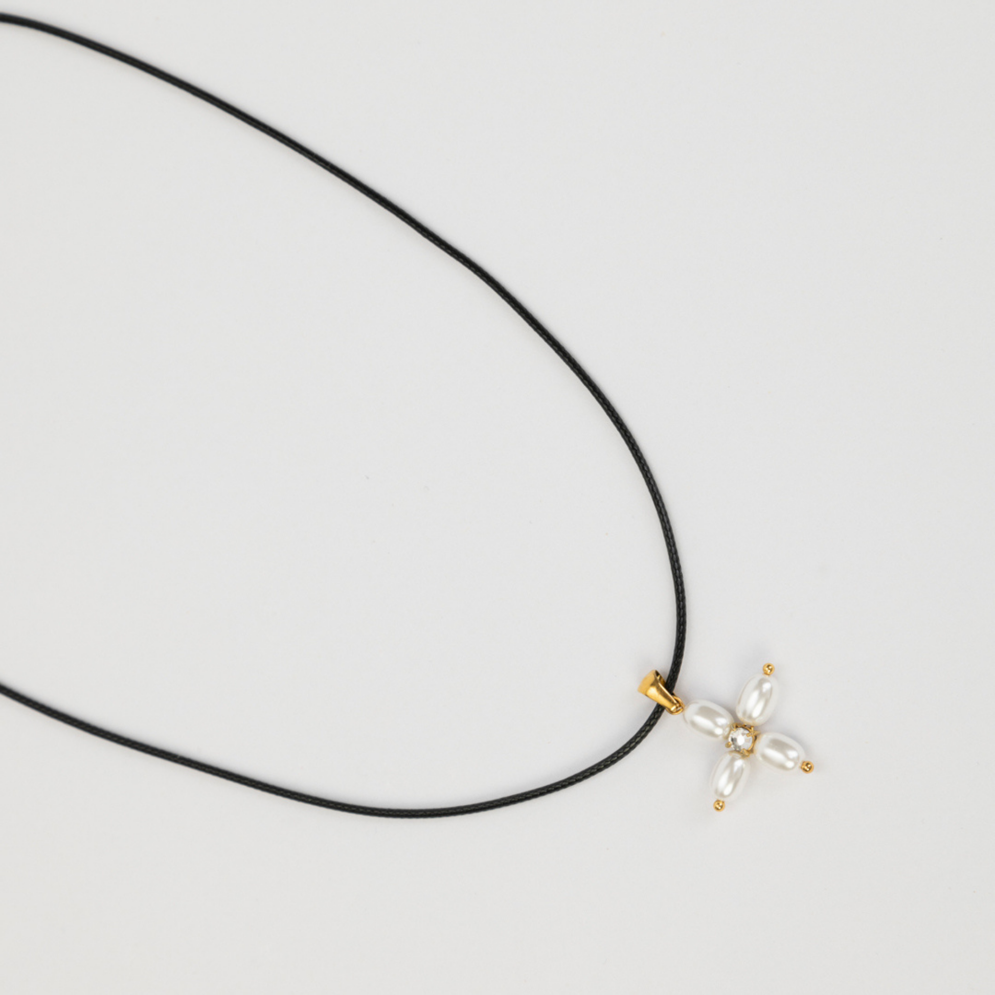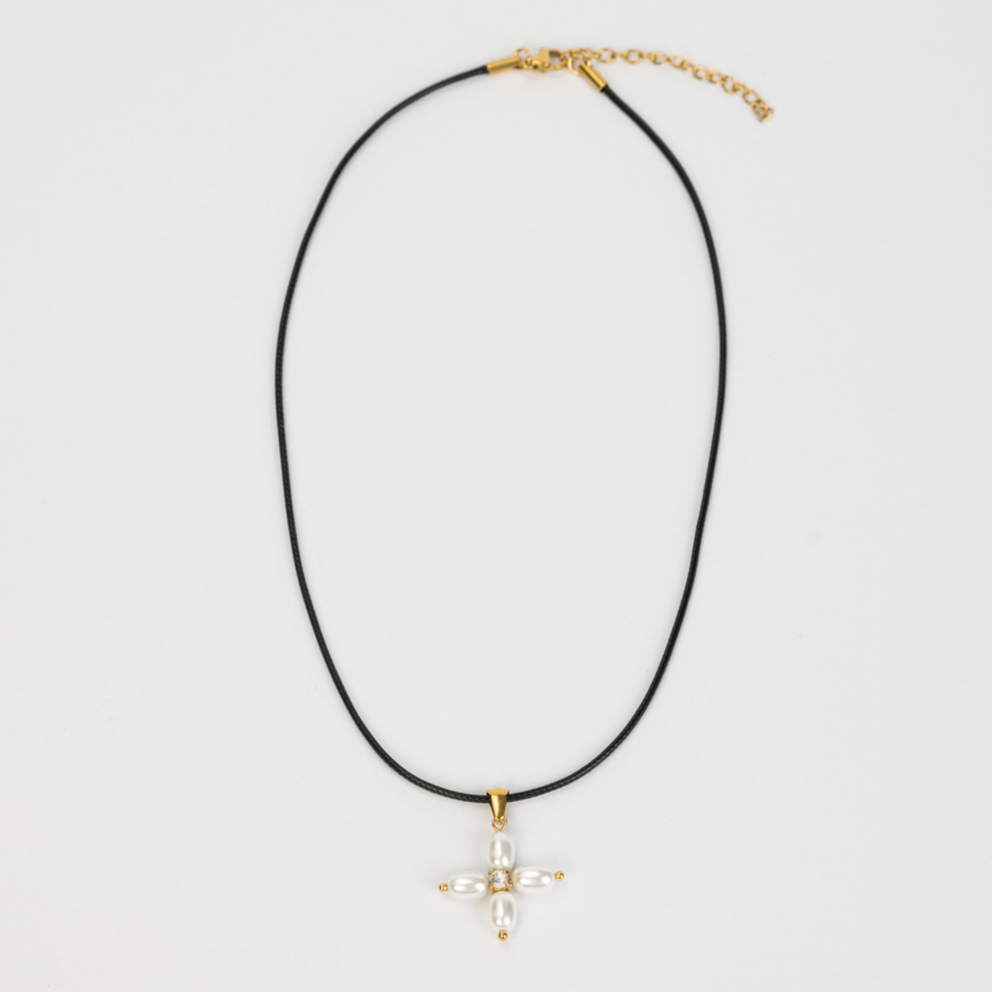 Zawieszka w kształcie perłowego krzyża to połączenie delikatności i charakteru. Osadzona na klasycznym czarnym rzemyku, tworzy nowoczesną interpretację ponadczasowej elegancji. Idealny wybór dla kobiet, które cenią klasykę w nowym wydaniu.